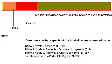 Total nitrogen (TN) is the most useful routine laboratory measure, as N is very labile and changes rapidly, both within the waterbody and in the removed sample. The full suite of nitrogen testing should be conducted where it is important to understand speciation within the waterbody. Should total nitrogen be required, use an appropriate method and analyse in the laboratory, as a high temperature digestion is required. Total nitrogen measures a combination of Kjeldahl (organic) nitrogen, oxidised nitrogen and ammonia. Subtracting oxidised nitrogen from total nitrogen provides a measure known as TKN (Total Kjeldahl Nitrogen) which is a sum of the organic N and ammonium components.