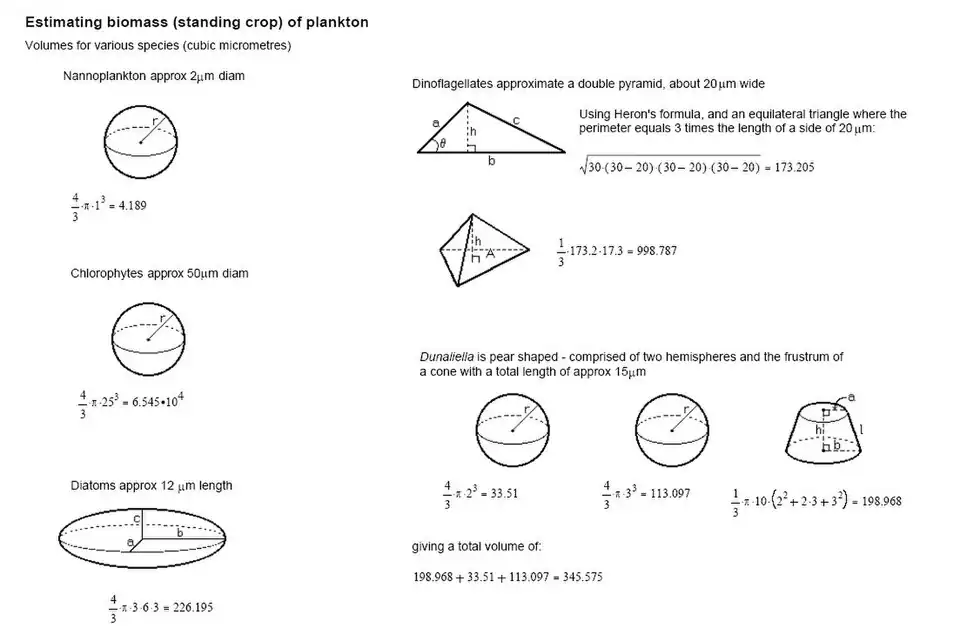 Wet algal biomass (biovolume) may be calculated (as a volume) from the shape and size of typical plankton present in your count, multiplied by the plankton count. Typical plankton volume calculations are illustrated in Diagram 3. Click on the thumbnail to obtain a larger version of the diagram. The groups of plankton illustrated in the diagram include those groups most commonly found in saline lakes.