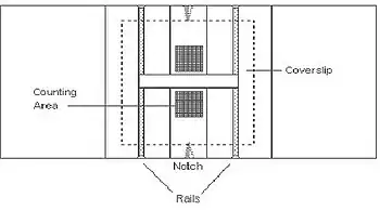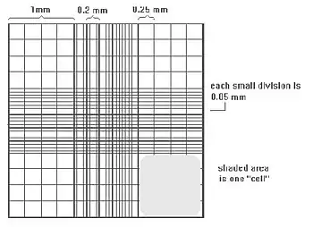 Haemocytometers have two main counting areas. A single counting area is shown in the diagram 2. Each counting area is divided into nine equal portions of 1mm by 1mm. These portions are referred to as CELLS.