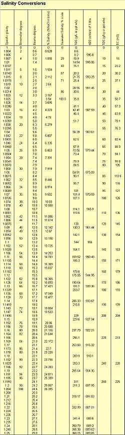 Conversion table This table is based on information collated by Prof. Bill (WD) Williams of Adelaide University. He presented the information at the 6th International Symposium on Saline Lake Research, Beijing, 1994, and argued strongly for the use of a standardised approach to measuring salinity. He felt that the use of direct, mass-derived measures such as density (either w/w or w/v) would enable scientists to more simply discuss and compare the properties of their lakes. Some indirect measures, such as electrical conductivity are well understood in the range 0-60mS/cm, but the relationship in non-linear in very hypersaline situations (Williams & Sherwood 1994, Williams 1986). Note that the C-TDS relationship shown in the table presented here is based on aqueous solutions of sodium chloride.