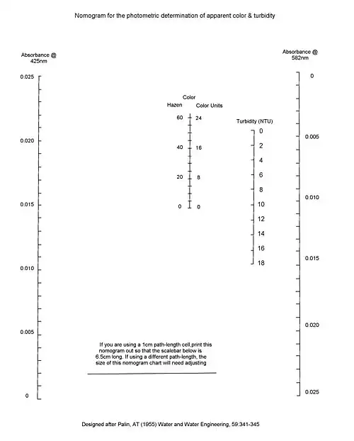Record the absorbance of the sample at 425nm and 580nm. As color and turbidity affect each other, correct by plotting the readings on the Nomogram Chart below. The chart is derived from AT Palin (1955) "Photometric determination of the colour and turbidity of water." Water & Water Engineering, 59:341-345.
