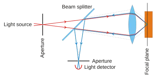 In a conventional (i.e., wide-field) fluorescence microscope, the entire specimen is flooded evenly in light from a light source. All parts of the specimen in the optical path are excited at the same time and the resulting fluorescence is detected by the microscope's photodetector or camera including a large unfocused background part. In contrast, a confocal microscope uses point illumination and a pinhole in an optically conjugate plane in front of the detector to eliminate out-of-focus signal - the name "confocal" stems from this configuration. As only light produced by fluorescence very close to the focal plane can be detected, the image's optical resolution, particularly in the sample depth direction, is much better than that of wide-field microscopes. However, as much of the light from sample fluorescence is blocked at the pinhole, this increased resolution is at the cost of decreased signal intensity, so long exposures are often required.