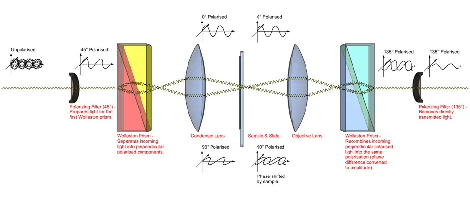 - The rays travel through adjacent areas of the sample, separated by the shear. The separation is normally similar to the resolution of the microscope. They will experience different optical path lengths where the areas differ in refractive index or thickness. This causes a change in phase of one ray relative to the other due to the delay experienced by the wave in the more optically dense material. The passage of many pairs of rays through pairs of adjacent points in the sample (and their absorbance, refraction and scattering by the sample) means an image of the sample will now be carried by both the 0° and 90° polarised light. These, if looked at individually, would be bright field images of the sample, slightly offset from each other. The light also carries information about the image invisible to the human eye, the phase of the light. The different polarisations prevent interference between these two images at this point.