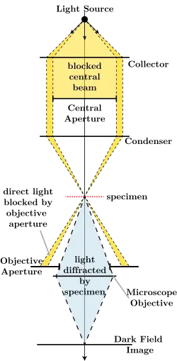 The light path through a dark field microscope is as follows: