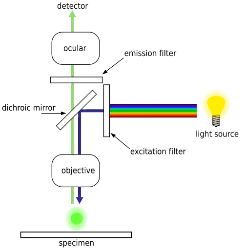 The specimen is illuminated with light of a specific wavelength (or wavelengths) which is absorbed by the fluorophores, causing them to emit light of longer wavelengths. The illumination light is separated from the much weaker emitted fluorescence through the use of a spectral emission filter. Typical components of a fluorescence microscope are a light source (xenon arc lamp or mercury-vapor lamp are common; more advanced forms are high-power LEDs and lasers), the excitation filter, the dichroic mirror (or dichroic beamsplitter), and the emission filter. The filters and the dichroic are chosen to match the spectral excitation and emission characteristics of the fluorophore used to label the specimen. In this manner, the distribution of a single fluorophore is imaged at a time. Multi-color images of several types of fluorophores must be composed by combining several single-color images.
