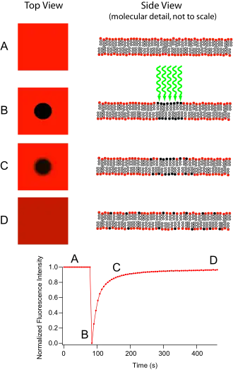 Fluorescence recovery after photobleaching (FRAP) denotes an optical technique capable of quantifying the two dimensional lateral diffusion of a molecularly thin film containing fluorescently labeled probes, or to examine single cells. This technique is very useful in biological studies of cell membrane diffusion and protein binding. In addition, surface deposition of a fluorescing phospholipid bilayer (or monolayer) allows the characterization of hydrophilic (or hydrophobic) surfaces in terms of surface structure and free energy.
