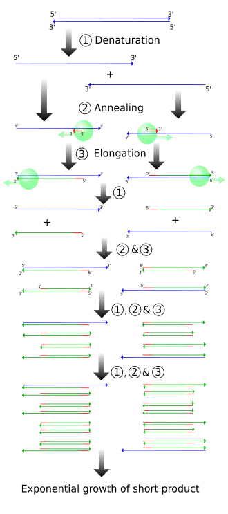- Elongation: The temperature at this step depends on the DNA polymerase used; Taq polymerase has its optimum activity temperature at 75–80 °C, and commonly a temperature of 72 °C is used with this enzyme. At this step the DNA polymerase synthesizes a new DNA strand complementary to the DNA template strand by adding dNTPs that are complementary to the template in 5' to 3' direction, condensing the 5'-phosphate group of the dNTPs with the 3'-hydroxyl group at the end of the nascent DNA strand. The extension time depends both on the DNA polymerase used and on the length of the DNA fragment to be amplified. As a rule-of-thumb, at its optimum temperature, the DNA polymerase will polymerize a thousand bases per minute. Under optimum conditions, i.e., if there are no limitations due to limiting substrates or reagents, at each extension step, the amount of DNA target is doubled. After elongation, the DNA is denatured again and the newly synthesized fragments can serve as templates in the next cycle, leading to exponential amplification of the specific DNA fragment.
