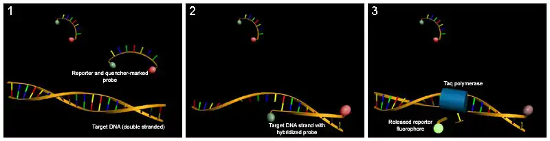 This method relies on an oligonucleotide with a fluorescent reporter at one end and a quencher of fluorescence at the opposite end. As long as the probe is intact, the close proximity of the reporter to the quencher prevents detection of its fluorescence. The probe anneals between the two primers and is degraded by the 5'-3' exonuclease activity of Taq polymerase during elongation. This breaks the reporter-quencher proximity and thus allows unquenched emission of fluorescence, which can be detected after excitation with a laser. An increase in the product targeted by the reporter probe at each PCR cycle therefore causes a proportional increase in fluorescence due to the breakdown of the probe and release of the reporter.