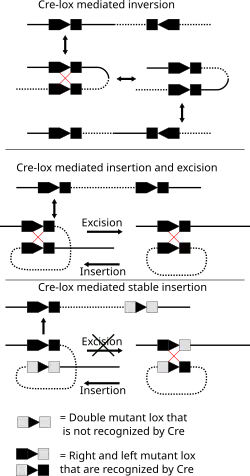 The products of Cre-mediated recombination at loxP sites are dependent upon the location and relative orientation of the loxP sites. DNA sequences found between two loxP sites are said to be "floxed". In this case the products of Cre mediated recombination depends upon the orientation of the loxP sites. DNA found between two loxP sites oriented in the same direction will be excised as a circular loop of DNA whilst intervening DNA between two loxP sites that are opposingly orientated will be inverted. Two separate DNA species both containing loxP sites can undergo fusion as the result of Cre mediated recombination. For example, plasmids can be joined using the variant lox sites 71 and 66.