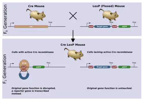 A conditional knockout allows gene deletion in a tissue or time specific manner. This is most often achieved using the Cre/lox system. The loxP sequences will be introduced into the germ-line via the same mechanism as for a normal knockout. This germ-line can then be crossed to another germ-line containing the gene for Cre recombinase. Typically, the gene will be controlled by a promoter which is tissue specific or only active during a distinct time in ontogeny. When Cre is expressed, it recombines the loxP sites and deletes the floxed gene.