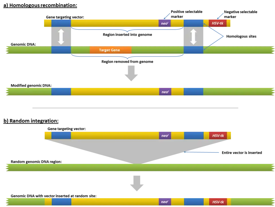 Because the desired type of DNA recombination is a rare event in the case of most cells and most constructs, the foreign sequence chosen for insertion usually includes a reporter. This enables easy selection of cells or individuals in which knockout was successful. Sometimes the DNA construct inserts into a chromosome without the desired homologous recombination with the target gene. To eliminate such cells, the DNA construct often contains a second region of DNA that allows such cells to be identified and discarded. Such a system is illustrated in the figure below.