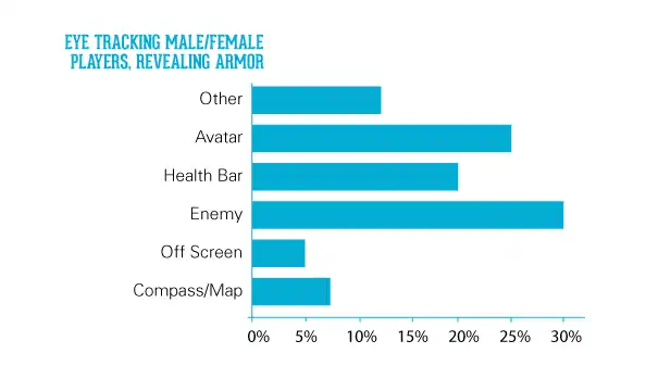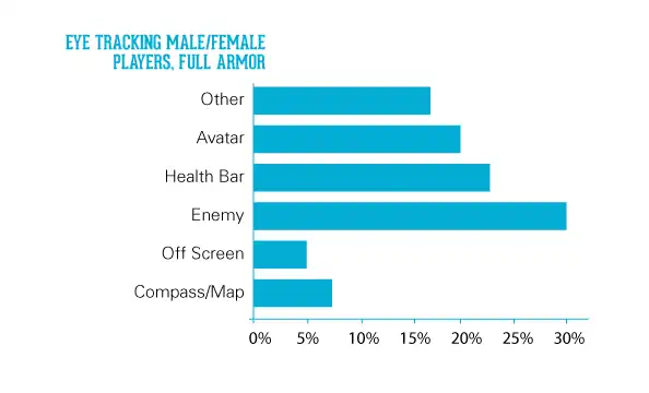 For the analysis of each subject, we focused on a few variables. The most important of which is eye tracking data, which will be separated into groups by gender, then further broken down by the gender of the avatar, and then again by type of armor. We also collected data to measure performance, which will then be compared against the subjects’ answers of the questionnaire. Performance is measured based on damage taken and damage dealt.