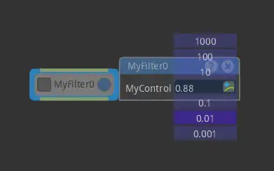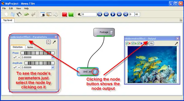 To bring up the parameters window just click on the node parameters button. A parameters window pops up showing the node's parameters. Some nodes, like move2D node, have parameters that will be shown on the output window.