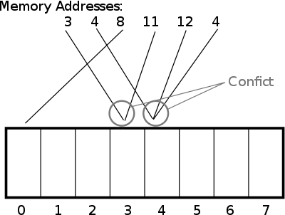 In a direct-mapped system, each memory address corresponds to only a single cache location, but a single cache location can correspond to many memory locations. The image above shows a simple cache diagram with 8 blocks. All memory addresses therefore are calculated as n mod 8, where n is the memory address to read into the cache. Memory addresses 0, 8, and 16 will all map to block 0 in the cache. Cache performance is worst when multiple data items with the same hash value are read, and performance is best when data items are close together in memory (such as a sequential block of program instructions, or a sequential array).