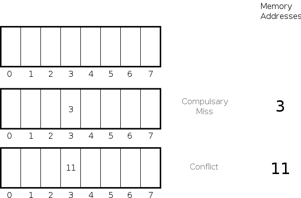 The image above shows the difference between a conflict miss and a compulsory miss. A compulsory miss is an instance where the cache must miss because it does not contain any data. For instance, when a processor is first powered-on, there is no valid data in the cache and the first few reads will always miss.