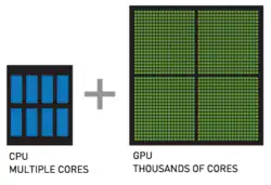 The CPU (central processing unit) has often been called the brains of the PC. But increasingly, that brain is being enhanced by another part of the PC – the GPU (graphics processing unit), which is its soul. Architecturally, the CPU is composed of a only few cores with lots of cache memory that can handle a few software threads at a time. In contrast, a GPU is composed of hundreds of cores that can handle thousands of threads simultaneously. The ability of a GPU with 100+ cores to process thousands of threads can accelerate some software by 100x over a CPU alone. GPU achieves this acceleration while being more powerful and cost-efficient than a CPU.