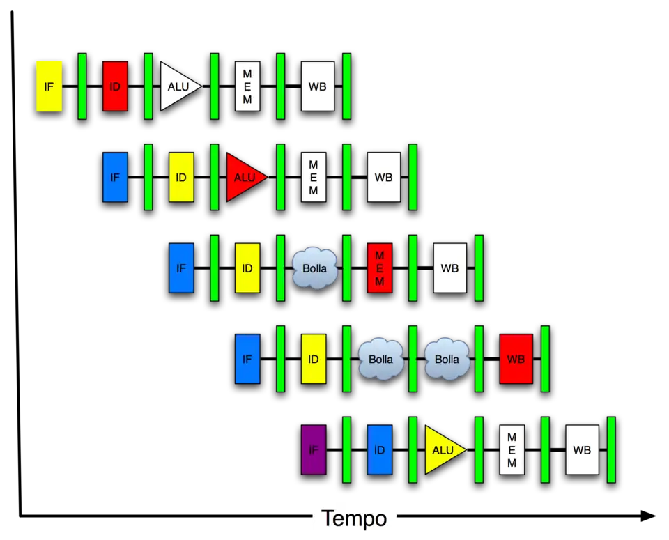In this image we can see "bubbles" drawn where data hazards occur. A bubble signifies that the instruction has stalled in the pipeline until a previous instruction completes. Once the previous instruction has completed, the stalled instruction continues moving.