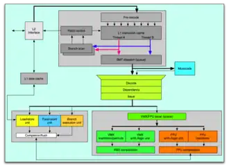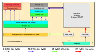 Block diagrams of the IBM Cell processor. The Cell processor has 8 SPE cores (left) and 1 PPE core (right). The PPE core is the primary core, and controls the behavior of the SPE cores.