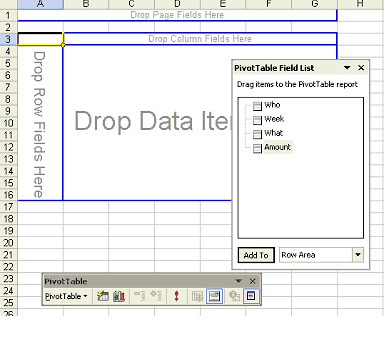 Drag the headers Who, Week and What into the ROW area, and the Amount header into the Data area. (Leave the Column area blank for now.) To change the placement of an item, drag the header title to the desired area. If the Amount tag does not show "Sum of Amount", double-click it and choose the Sum option. Double-clicking the headers gives options of showing/hiding specific data (like Empty and Activities, may come in handy) and removing subtotaling for this column. Right-clicking gives other options, among them Hide and Show Detail for reading totals only.