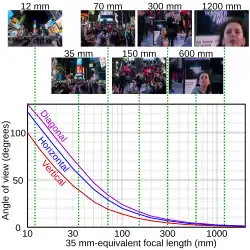 The field of view correlates to the focal length of the lens—the distance between where the lens is focused (at infinity) and the "optical center". The focal length (f) is given in millimeters (e.g. f=50mm). A larger focal length produces a narrow field of view, while a shorter focal length produces a wider angle.