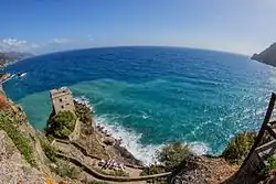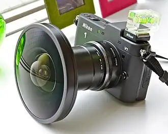 There are various wide-angle lenses, measured by the focal length. The "normal" lens for a 35mm camera is about 50mm focal length, and a wide angle lens has a shorter focal length, such as 35mm or 28mm. The shorter the focal length, the greater the perspective distortion. At the extreme end, there are wide-angle lenses with a focal length of 10mm or so using a "fish eye" projection: up to a 180 degree field of vision can be captured. However, the final photograph looks highly distorted and looks like a photograph of the scene as if reflected on a silvered ball. It may be that the name of this type of lens comes from what one imagines a fish sees under water, or that the image is distorted around a central point much like what a fish eye looks like.