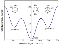 Torsional rotations, which can also be described as dihedral interactions come about when a system of 4 or more atoms form a molecule. This interaction relies upon the rotation central bond into a favorable orientation with the most stable overlap conformation. Some of these known conformations are called periplanar, anticlinal, gauche, and antiperiplaner, listed in order of highest to lowest energy. Observing Newman projections upon the energy we can see where the unfavorable confirmational interactions will lie. The methyl groups here will be considered large and have unfavorable overlap with one another. Mathematically this can be represented using the following equation: