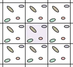 A particle in a periodic cell has non-bonded interactions with the other particles both in the original cell, and also in the surrounding cells (the periodic images of the original cell). The non-bonded potential energy () can be written as: