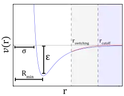 Non-bonded cutoffs are employed so as to save computational resources without sacrificing validity of results. These cutoffs are used to model long-range interactions between atoms or molecules in a simulation, and essentially truncate the interactions at a specific distance. Because intermolecular interaction potentials converge to a particular value (namely zero) as , the interaction potential can effectively be tuned to this value after a certain distance. In the case of dispersion and repulsion interactions, which are modelled by the Lennard-Jones potential, a switching function, , is employed in the simulation. This switching function causes the decay of the interaction to reach zero by a desired cutoff distance, at which point the two molecules or atoms involved in the intermolecular interaction do not interact through the Lennard-Jones potential at all,