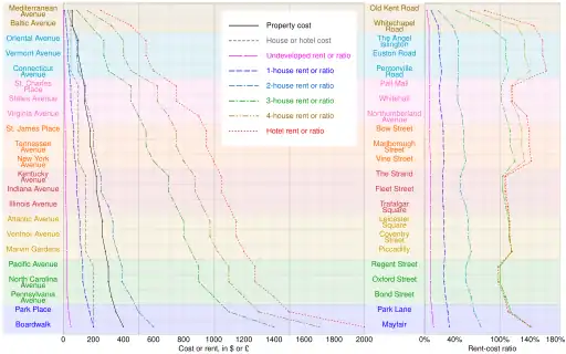 The first three factors are obvious: valuable properties have a better ratio of expenditure to return. The fourth factor is more interesting because it determines how often players will land on each property and thus pay rent to its owner. In recent years, computer simulations have allowed a probabilistic analysis of the frequency with which each square is visited during the average game.