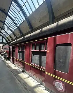 We note that a passenger car of this compartmented design typically would have ten compartments. At 8 students per compartment that gives a capacity of, at most, 80 students per car. With a school population of 280, this would mean a minimum of four cars; a school population of 840 would require 11 cars. If we take the larger number and add a luggage van and a brake van, and possibly an additional passenger car, we end up with one engine pulling 14 cars, a large but not extreme number for a single large steam engine. As noted in the Hogwarts article, there is some dispute over the size of the school; we can see here that the requirement that students take the Express to school does not lend significant weight to either side of the dispute.