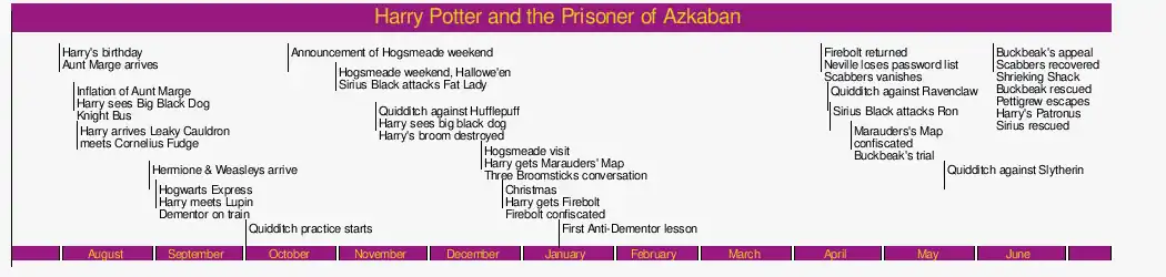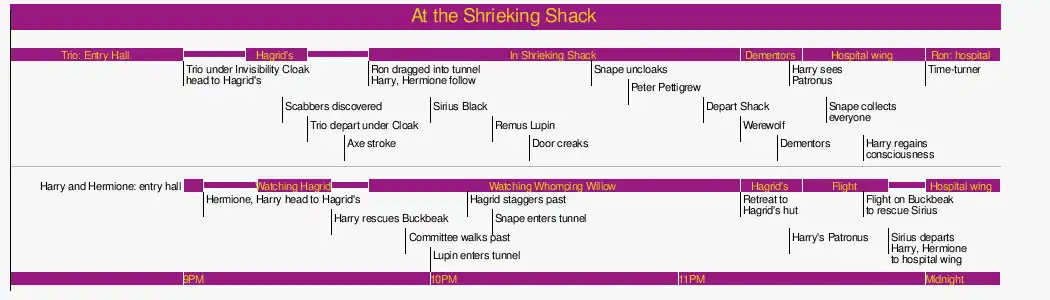 Internal evidence suggests that these events, filling more than five of the book's twenty-two chapters, occurred between about 8:30 PM on the last day of exams, and 12:30 AM the following morning, in Harry's third year at Hogwarts. The constraints of the timeline generator require that we assign actual times. We do not intend these times to be taken as in any way being canon, except for 9PM and midnight which are specifically given in the text; all other times are guides only.