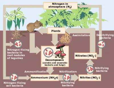 The most common soil micro-organisms capable of nitrogen fixation is symbiotic (close association between plants and animals) nitrogen fixing bacteria found as nodules (lumps) on the roots of legumes (plants that have pods (fruits or roots)). These fix nitrogen into nitrate ions (NO3-). Legumes that have these nitrogen-fixing bacteria living on their roots such as clover, beans, alfalfa, lupines and peanuts are able to use nitrogen almost directly.