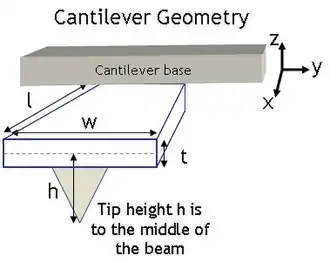 Cantilever has width w, thickness t, length L and the tip height from the cantilever middle to to the tip is h.