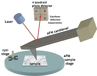 If the sample is scanned sideways in the y direction, the frictional forces will apply a torque on the cantilever, bending it sideways and this can be used to measure the frictional forces. The lateral force gives both a lateral and torsional deflection of the tip. Only the torsional can be detected in the photodetector.