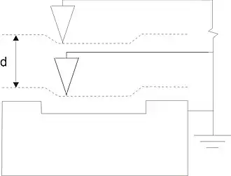 In the Dual Scan (DS, or sometimes called lift-mode method) one first makes a line scan with no potential on either the AFM tip or the sample in either tapping or non-contact mode. Next, the AFM tip is raised several tens of nanometers (30-70 nm) above the surface. A new line scan is made at this height, but this time with a potential on the sample also in non-contact mode. This is repeated over the desired scan area until the whole area has been scanned. For imaging the surface potential, the phase of the cantilever vibration is mapped out. The principle is shown in the figure where d is the distance between the tip and the surface in the second scan. The phase shift is dependent on the force () acting on the tip [4]