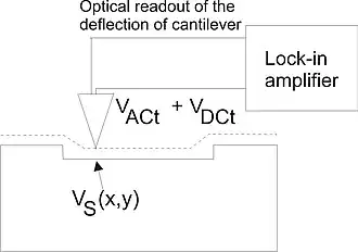 The frequency of the AC signal is much lower than the resonance frequency of the cantilever (a factor of 10) so the two signals can be separated by a lock-in amplifier. Via the electrostatic forces the setup measures the surface potential. If one assumes that the electrostatic force () between the tip and surface is given by [2]