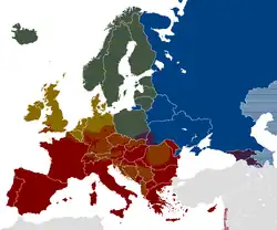 Different drinks are more popular in different regions of Europe. Red indicates the popularity of wine, yellow indicates the popularity of beer, and blue indicates the popularity of vodka.