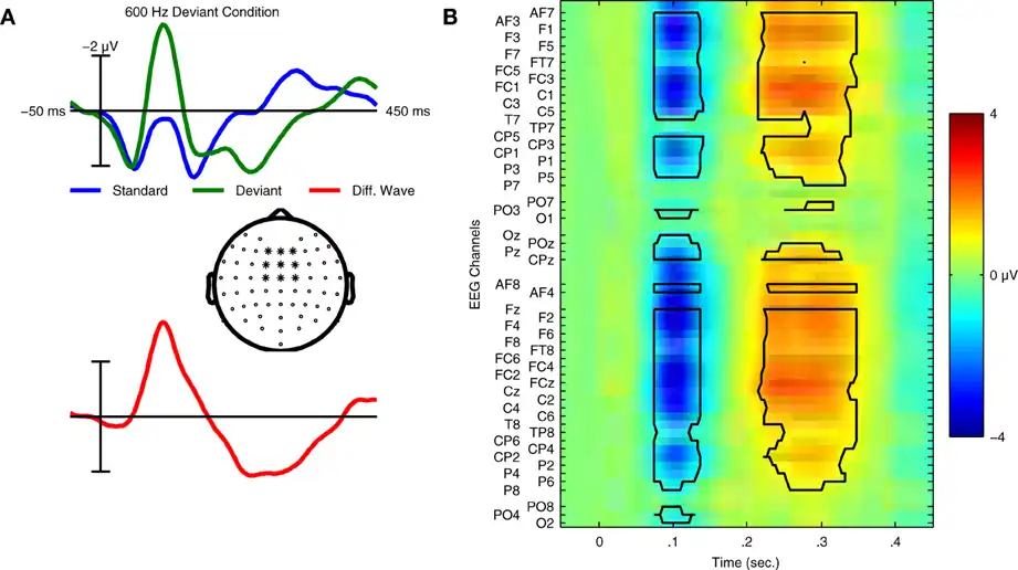 In contrast to Conboy and her colleagues (2005), Kuhl et al. (2008) employed EEG and the so-called ‘oddball paradigm’. The ‘oddball paradigm’ involves the presentation of a background or standard stimulus (here: a syllable) and the presentation of a deviant stimulus, i.e., a different syllable in comparison to the standard stimulus (cf. Conboy et al., 2008, for a description of the oddball paradigm). Both stimuli are presented in a random order, with the deviant being displayed only in about 15 per cent of cases (Conboy et al. 2008; Kuhl et al., 2008). Subsequently, the average ERP waveforms for both standard and deviant are calculated, as well as their difference (Conboy et al., 2008). The deviant-specific ERP activity is called ‘mismatch negativity’ (MMN; Figure 2; see also Wikipedia entry for more details). It is represented by a negative peak at around 100-250 ms and regarded as an indicator for the (pre-attentive) discrimination of acoustically and phonetically different stimuli (Conboy et al., 2008). The larger the amplitude of the negativity, the better the discrimination (Kuhl et al., 2008). Importantly, as the MMN is elicited also in the absence of attention, this paradigm is particularly well suited to study perceptual processes already in very young children. Adults show negativities only, whereas infants show in addition positive peaks between 300-500 ms (Friederici, 2005, 2006).