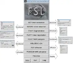 FSL is a comprehensive library of analysis tools for FMRI, MRI and DTI brain imaging data. It could be used either by FSL main GUI or the commond-lines. The advantage of the GUI lies in its simplicity but the drawback is the less flexibility comparing to the command-lines. FSLView as the display tool could be completely separate use from processing and analysis. Currently FSL only accepts the input files in NIFTI format, and the DICOM files need to be converted to NIFTI after acquisition and before processing. The conversion from DICOM to NIFIT could be fulfilled by several methods, such as dcm2nii from mricron or dcmstack. In the GUI there are nine popular modules are defined, and depending on the input file types, they fall into functional-oriented, structural-oriented or diffusion-oriented modules. The structural-oriented functions include "BET brain extraction", "FAST segmentation", "FLIRT: linear registration"; the functional-oriented functions involve "SUSAN noise reduction","FEAT FMRI analysis" and "MELODIC ICA"; the DTI-oriented functions incorporate "FDT diffusion". Besides these functional modules, there is a simulator called "POSSIUM MRI simulator", which is a software tool to produce realistic simulated MRI and FMRI images or time series. POSSUM (Physics-Oriented Simulated Scanner for Understanding MRI) includes tools for the pulse sequence generation, signal generation, noise addition and image reconstruction.