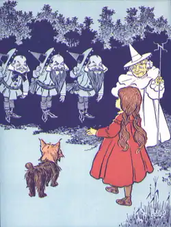 Tri ek les esed viros e un esed fema, e omnes esed stranjim vestat. Les portat rondi chapeles kel vadad supru a mikri punte ye un pede super lesen kapes, kun mikri kloches sirk li bordes kel klochetad dolsim durant ke les movad. Li chapeles del viros esed blui; li mikri feman chapele esed blanki, e la portad blanki robe kel pendad kom faldes fro lan shultres. Super lu esed arosat mikri astres kel sintileskad in li sune kom diamantes. Li viros esed vestat in blue, del sami kolore kam sen chapeles, e portad bonim polit butes kun profundi rule de blue an li kulmines. Li viros, Dorothy pensad, esed sirk tam oldi kam Onklo Henry, den du ek les haved barbes. Ma li mikri fema esed sinduto multi plu oldi. Lan fasie esed kovrat per sulkes, lasen hares esed preske blanki, e la marchad kelkigrad rigidim.