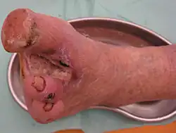 Diabetes management should be deployed with concern for long term complications as well as immediate relief. Impaired circulation is a common problem for patients with diabetes. Circulatory conditions can cause tissue hypoxia (lack of oxygen). Neuropathy associated with diabetes reduces ability to sense pressure. As a result, patients with diabetes may experience trauma, especially to the feet, without realizing it. Diabetic ulcers heal more slowly because of the poor circulation. The wounds are prone to infection because of the high levels of sugar in circulation, and immunocompromise may also be present. Necrosis of the toes and feet, leading to amputation, are common enough that regular podiatrist appointments are usual.
