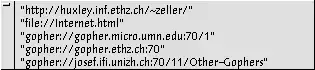 - ↑ At 2021-11-31 gopher://gopher.ethz.ch does not respond. Desktops.OpenDoc "gopher://gopher.floodgap.com/" responds with a page occupying more than one screen.