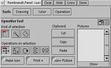 Desktops.OpenDoc Rembrandt.Panel The panel offers three sets of tools as suggested by the button row [Drawing], [Operation] and [Color] in the Tools section at the top of the panel. The panel just opened already presents a Drawing Tool section and a Color Tool section. In fact, the panel is a "variable geometry" gadget which may contain only just the Tools section or one or more of the other sections which can be inserted by clicking the corresponding button at the top.
