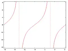 octave:1> x_part_left = linspace(-pi, -pi/2-0.001, 100); octave:2> x_part_mid = linspace(-pi/2, pi/2, 100); octave:3> x_part_right = linspace( pi/2+0.001, pi, 100); octave:4> plot(x_part_left, tan(x_part_left)); octave:5> hold on; octave:6> plot(x_part_mid, tan(x_part_mid)); octave:7> plot(x_part_right, tan(x_part_right)); octave:8> y_limit = 4; octave:9> axis([-pi, pi, -y_limit, y_limit]); octave:10> plot(linspace(-pi/2, -pi/2, 100), linspace(-y_limit, y_limit, 100), '.'); octave:11> plot(linspace( pi/2, pi/2, 100), linspace(-y_limit, y_limit, 100), '.'); octave:12> hold off;