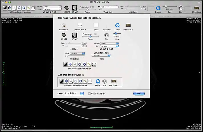 OsiriX has many functions and it is sometimes useful to modify the Graphic User Interface (GUI) for your personal needs. All windows in OsiriX are customizable. You can modify the tools displayed in the toolbar. Select “Customize Toolbar” from the “2D Viewer” or “3D Viewer” menus. You can also directly click in the toolbar by holding the ‘ctrl’ key. The “Customize” window will appear. Then simply “drag-and-drop” any tools from this window to the toolbar.