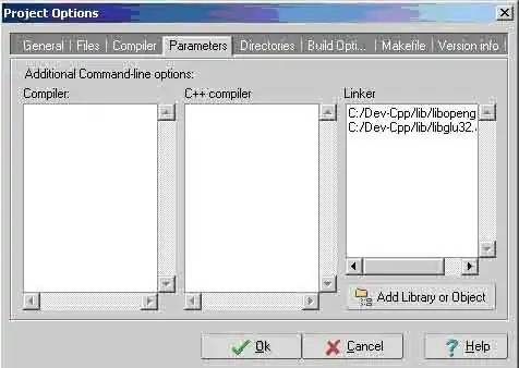 When you open up your Windows project, go to the top menu bar and click on Project and then Project Options. In the Project Options window, click on the Parameters tab. Under the third window (the “Linker” window) click on the Add Library or Object button. From there navigate to where you installed Dev – C++ (most likely “C:/Dev-Cpp”). When you get there, open up the “lib” folder. In there click once on the libglu32.a file and then hold down the Control key and click on the libopengl32.a file to select them both. Then click the Open button on the bottom of the dialog. Then click the OK button: