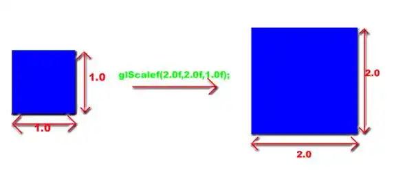 Scaling allows you to change the size of an object by however much you want it. To perform scaling you need to use the OpenGL function glScalef() which takes as parameters the x, y, and z scale of the object. When putting in the parameters, you need to remember that the parameters in glScalef() are multiplied by the original size of the object. For example, if you have a square drawn that is 1 unit wide and 1 unit high, to make the object two times the original size you would use 2.0f in the x and y parameters of the glScalef() function to indicate that you want to double the size of the square: