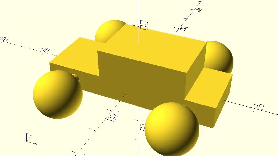 So far when you wanted to create an additional object in your model, you just added another statement in your script. The final car model is the union of all objects that have been defined in your script. You have been implicitly using the union command which is one of the available boolean operations. When using the union boolean operation, OpenSCAD takes the union of all objects as the resulting model. In the following script the union is used implicitly.