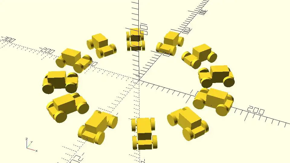 Addition, subtraction, multiplication and division are represented in OpenSCAD with the signs +, -, * and /. Apart from these fundamental operations, there are also a number of additional mathematical operations that can be useful when building more complex models. Two examples of this are the cosine and sine functions that you used to define a circular pattern of cars. Specifically, you used the cosine and sine functions to transform the polar coordinates of each car into Cartesian coordinates in order to translate it in its proper position. You can find all available math functions briefly listed in the cheat sheet.
