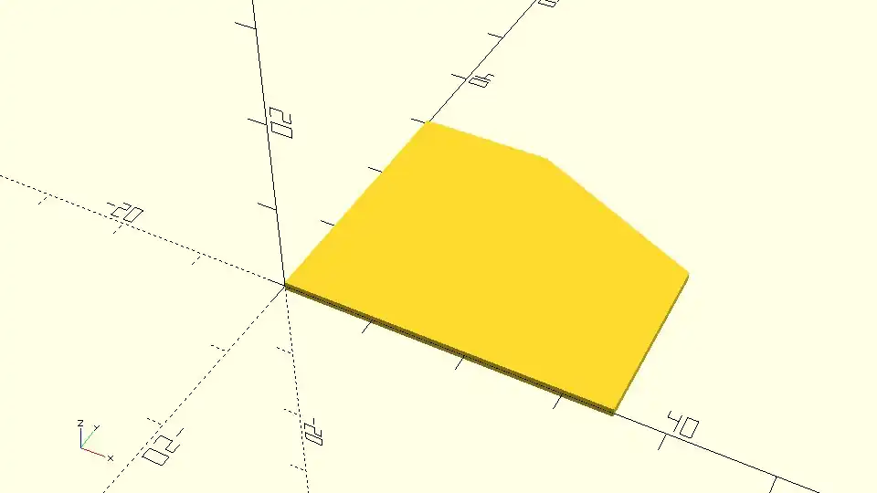 profile_1_polygon.scad p0 = [0, 0]; p1 = [0, 30]; p2 = [15, 30]; p3 = [35, 20]; p4 = [35, 0]; points = [p0, p1, p2, p3, p4]; polygon(points); |